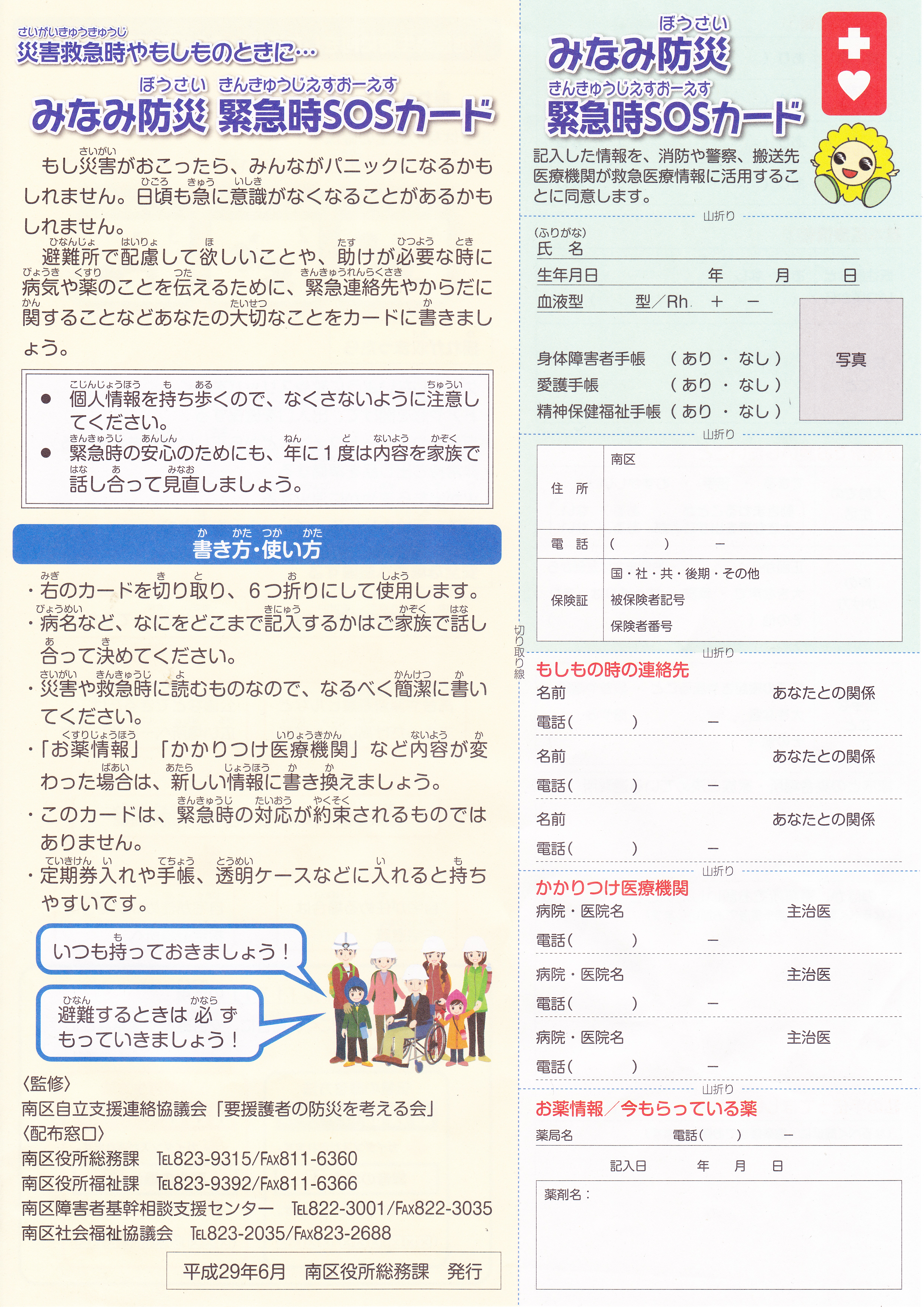 南区自立支援連絡協議会「要援護者の防災を考える会」監修で、災害救急時やもしもの時に役立つ、みなみ防災緊急時SOSカードを作りました。