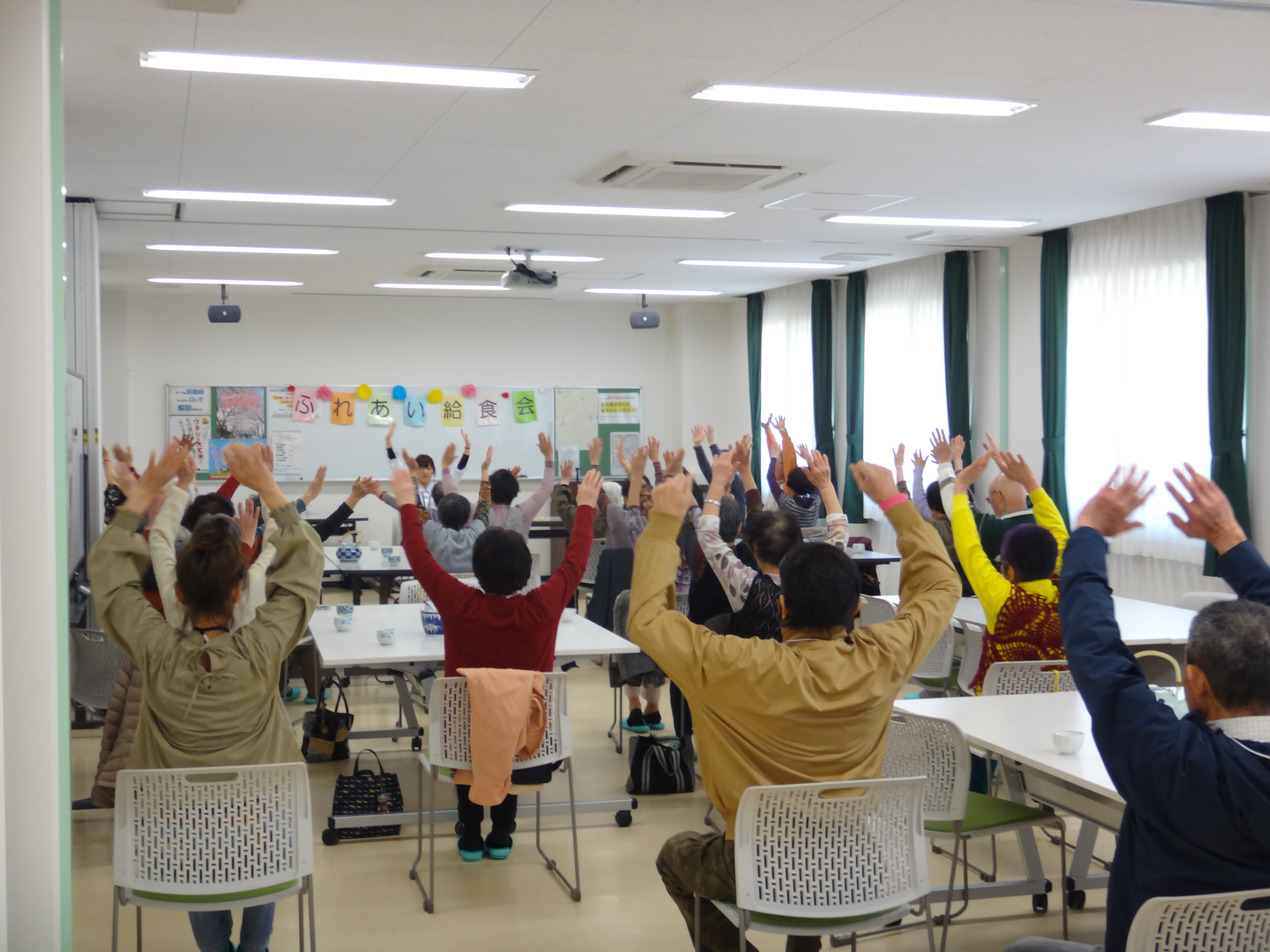 一人暮らしの高齢者約25名が参加したふれあい給食会は、南保健所保健師の指導で腹ごなしに「スマイル体操みなみ」で軽く運動。