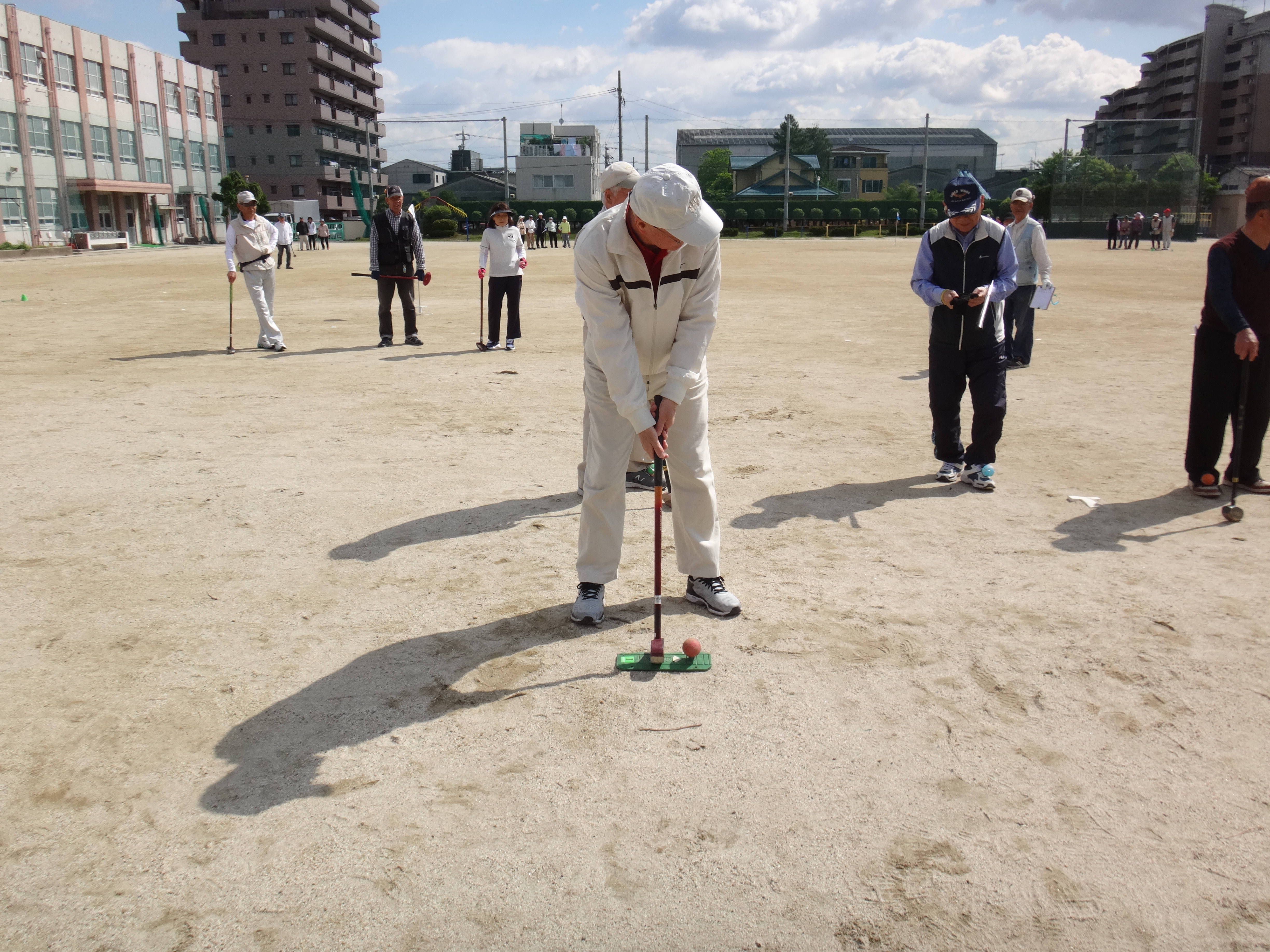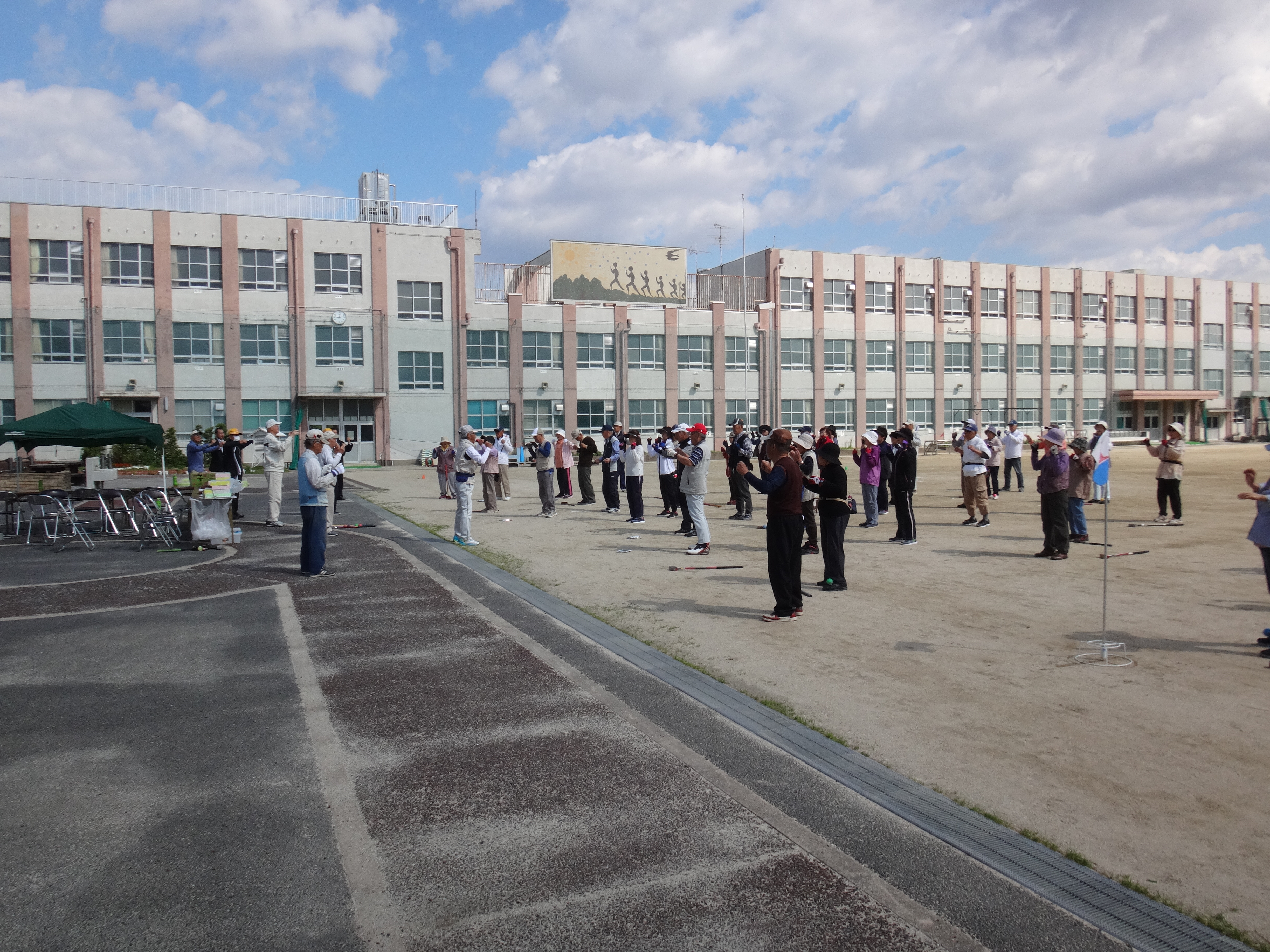 普段から町内ごとにグランドゴルフを楽しんでいる老若男女?約50名が星崎小学校のグランドへ集まり、日頃の成果を発揮していました。