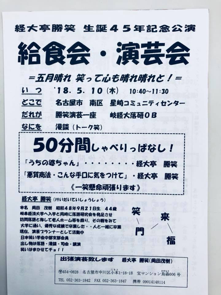 経大亭 勝笑 生誕45年記念公演と題し、50分間しゃべりっぱなし!の漫談「うちの婆ちゃん」・「悪質商法こんな手口に気を付けて」・・・