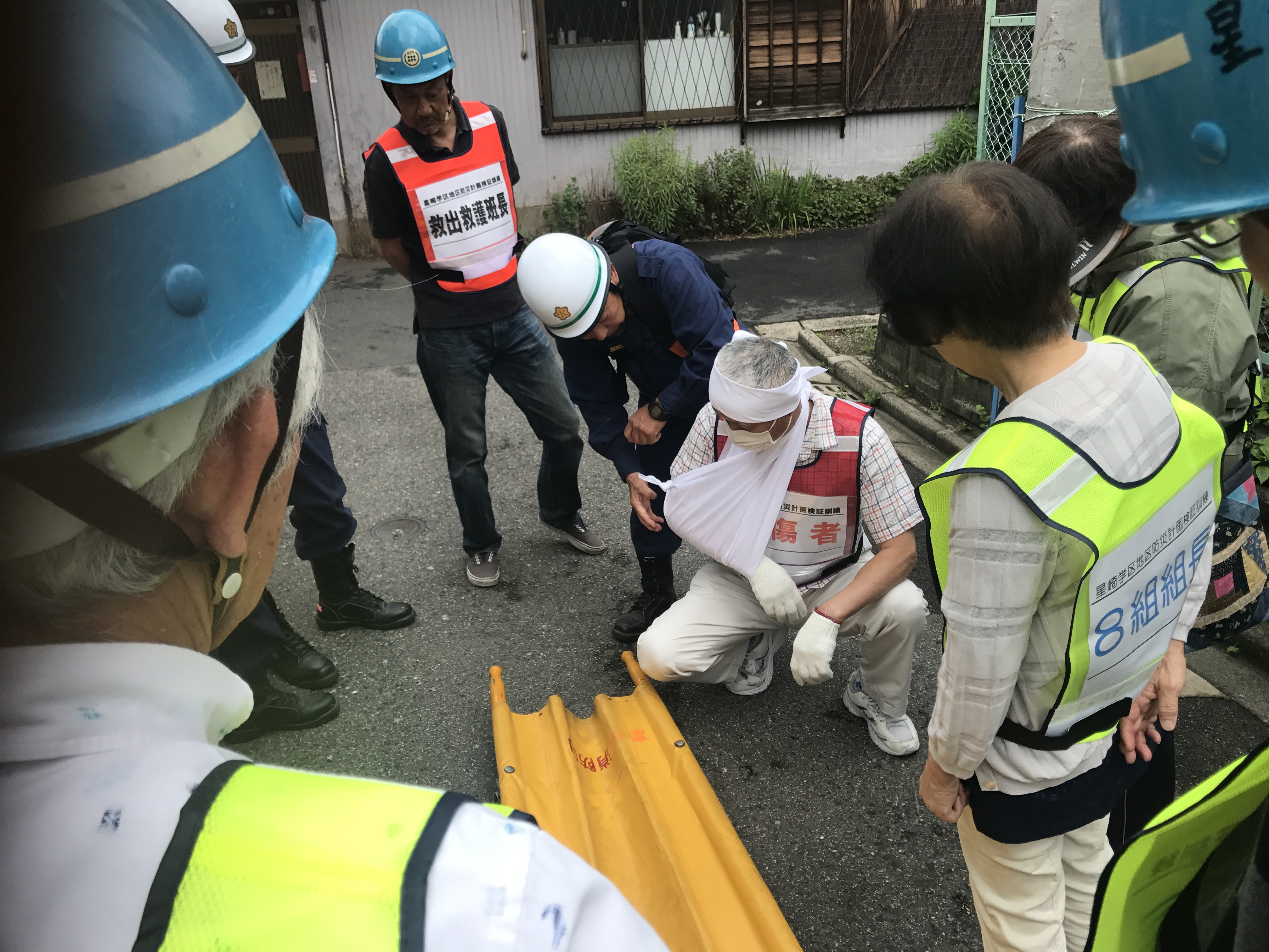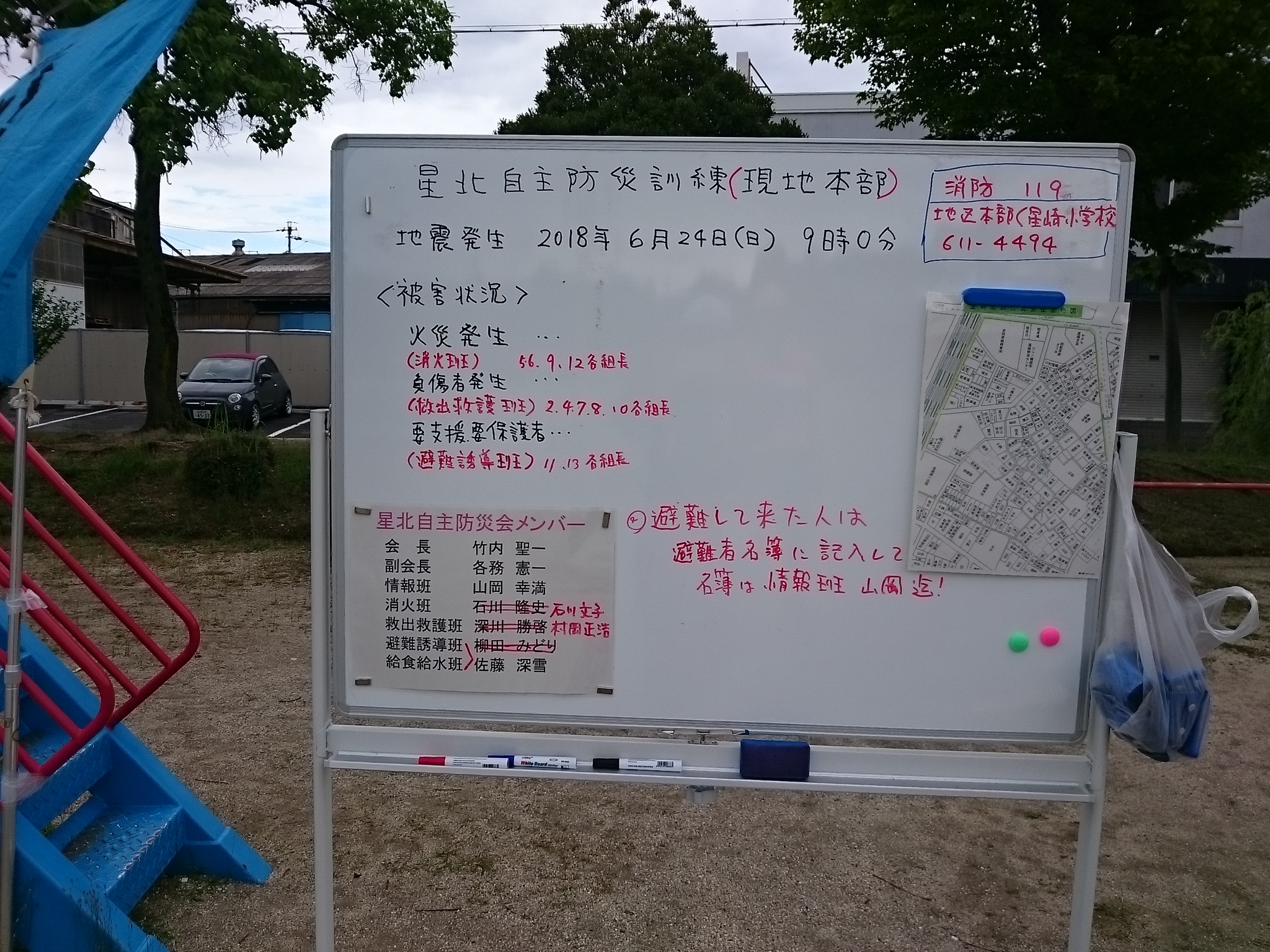 6月24日(日)午前9時、震度6強の地震が起き他ことを想定した、地域密着型訓練が行われました。星南は旧星崎診療所、星北は星崎第二公園を現地本部を立ち上げ、各組長さんからの報告を受け、自主防災会長さんは班長さんにてきぱきと指示を出していました。