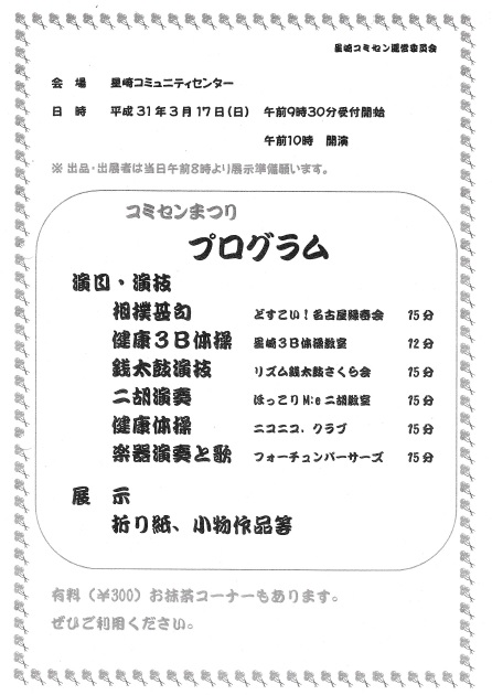 トピックス印刷2019/03/13 12:11 投稿者:hoshizaki星崎コミセンまつり開催のお知らせ平成31年3月7日(日)第3回星崎コミセンまつりが開催されます。 お時間がありましたらお出かけください。入場無料です。 星崎学区連絡協議会(名古屋市南区) 公式ホームページへ戻る
