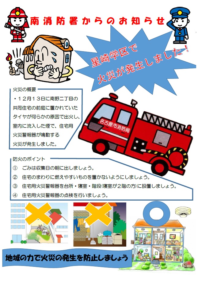 12月13日午後、南野2丁目の2階建アパート1階ベランダから出火し、タイヤやバスタオルなどを焼く火災が発生しました。幸いにもけが人はなかったとのこと。